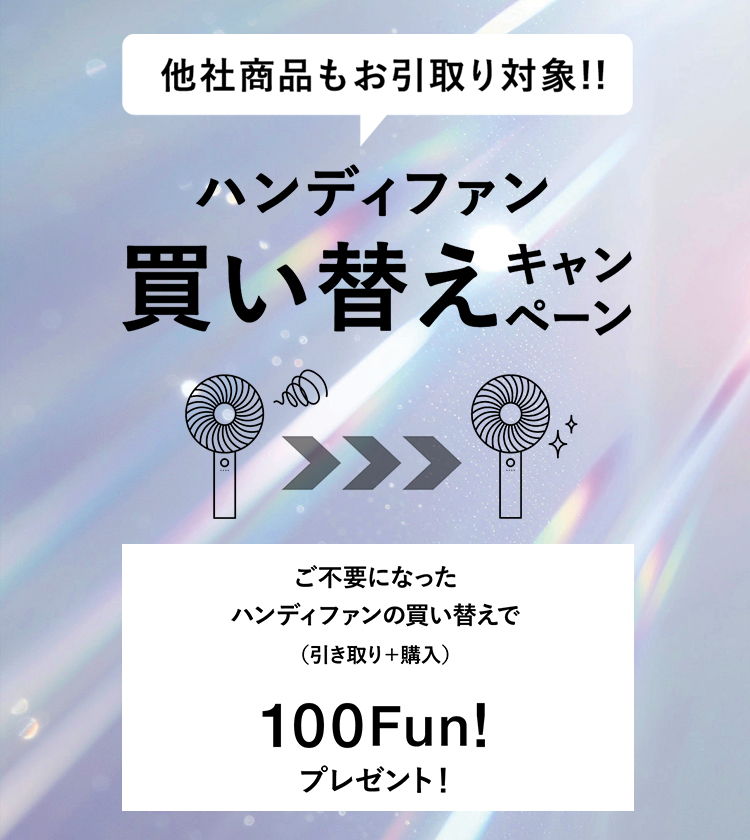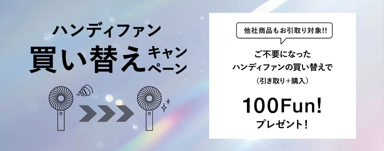 キャンペーン期間中、不要な充電式ハンディファンを店舗にお持ち込みのうえ、対象のハンディファンをご購入いただいたお客様に、100Fun!をプレゼントします。